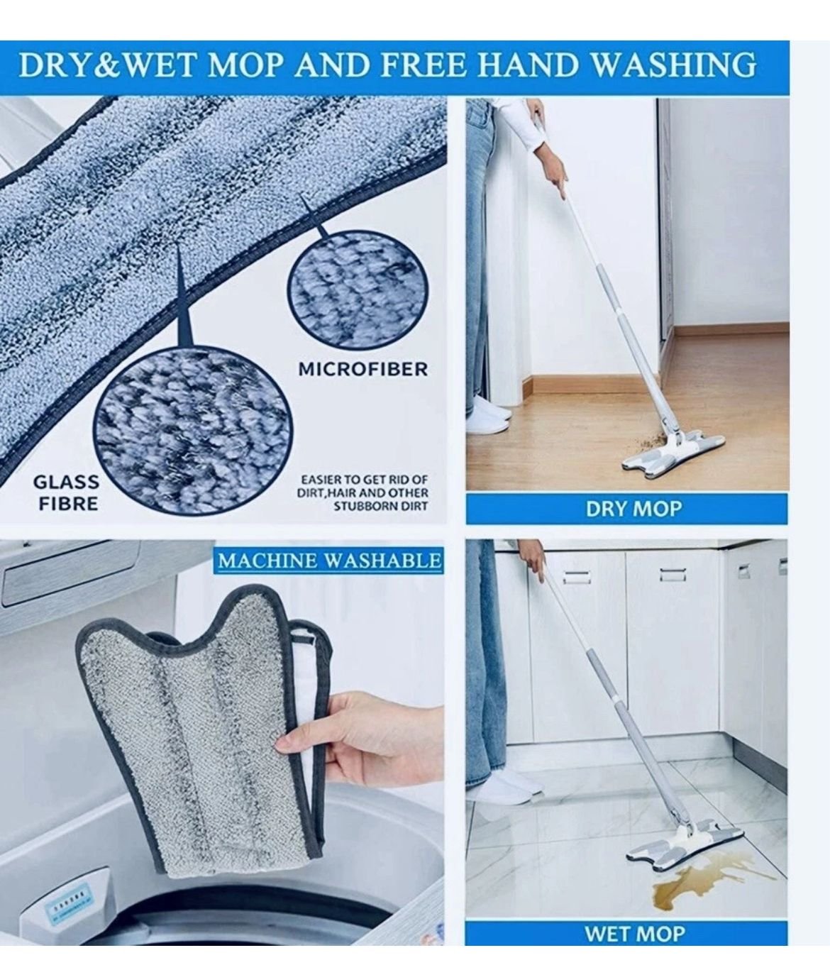 High-Quality Mop Heads: Crafted from durable and highly absorbent microfiber, the mop efficiently collects dirt, dust, and debris. It’s perfectly compatible with a range of flooring surfaces, including hardwood, tiles, and laminate.